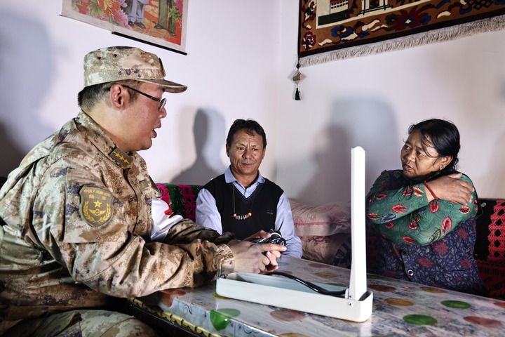 阿里軍分區(qū)某邊防團扎西崗邊防連軍醫(yī)給當(dāng)?shù)厝罕娍床。?023年9月27日攝)。新華社發(fā)(李思鑫 攝)