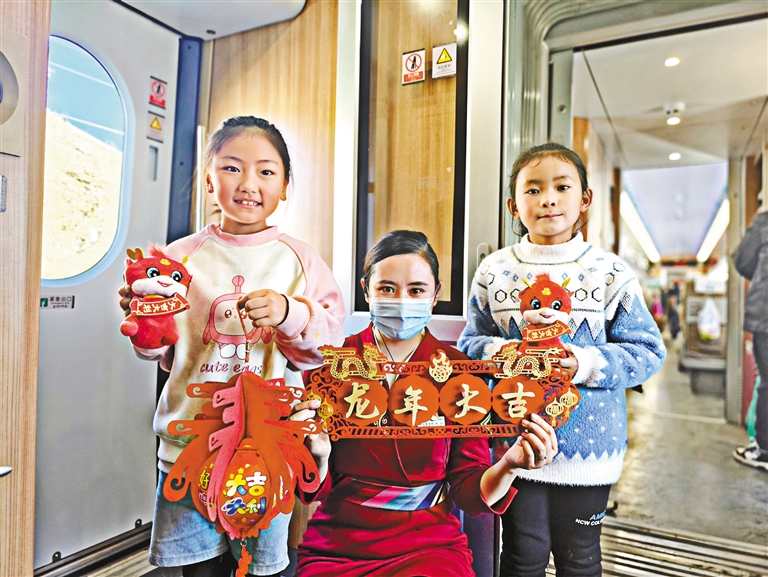 春運期間,鐵路部門踐行“天路格?;ā狈?wù)品牌理念,將車站、列車裝飾一新,為旅客提供優(yōu)質(zhì)、貼心的服務(wù)。圖為拉林鐵路動車組上的乘務(wù)員把龍年禮物送給孩子們。