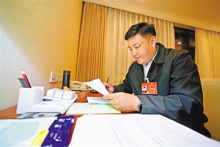 圖為全國人大代表拉瓊在會前完善發(fā)言材料。