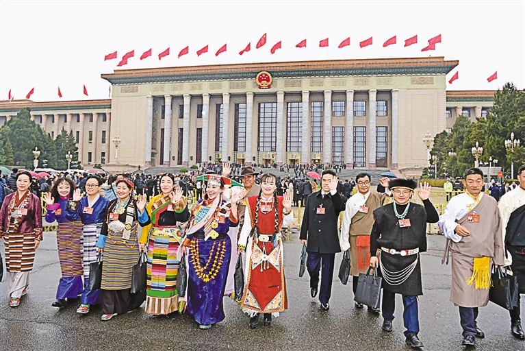 圖為全國人大代表聆聽政府工作報(bào)告后,滿懷信心走出人民大會(huì)堂。記者 旦增西旦 攝