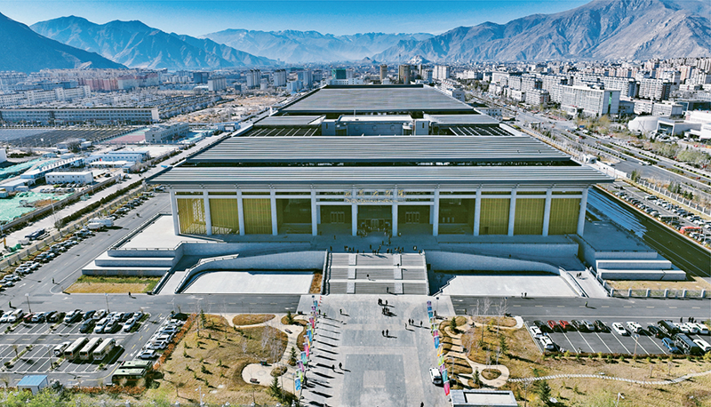 2023年12月15日,西藏大劇院開臺演出活動舉行,西藏文化新地標(biāo)西藏大劇院正式啟用。圖為空中俯瞰西藏大劇院(無人機照片)。 新華社記者 晉美多吉/攝