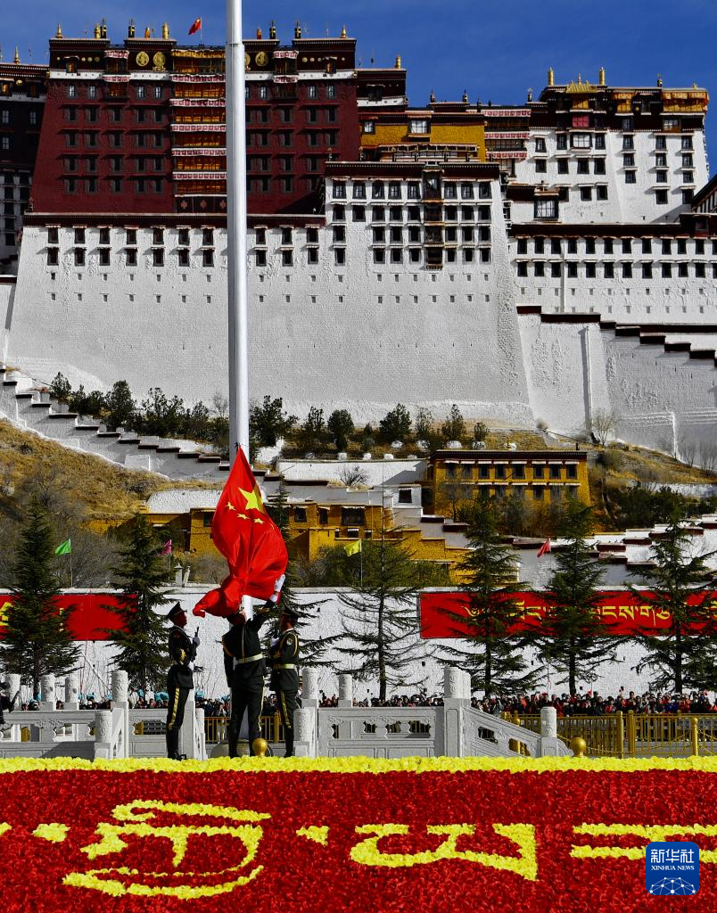 3月28日,拉薩布達(dá)拉宮廣場(chǎng)舉行升旗儀式。新華社記者 張汝鋒 攝