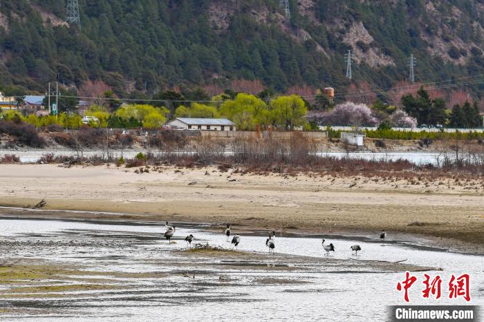 圖為黑頸鶴河邊覓食嬉戲。索朗多杰 攝