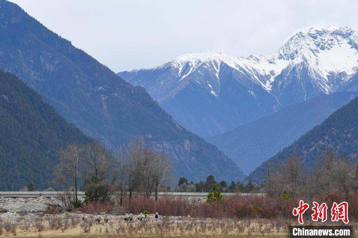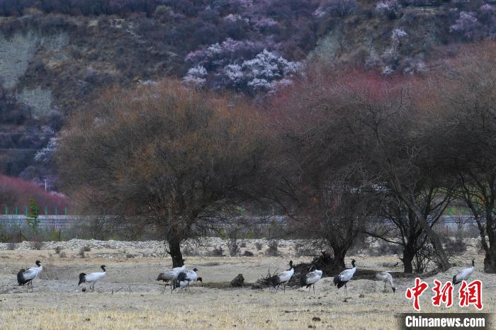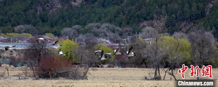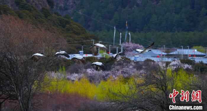 3月30日,在西藏林芝市巴宜區(qū)更章門巴民族鄉(xiāng)境內(nèi),黑頸鶴在村莊里、盛開的桃花前、雪山下翩翩起舞,形成一幅絕美的自然畫卷。黑頸鶴,被譽為“鳥類大熊貓”,是國家一級保護(hù)野生動物,也是世界上唯一在高原地區(qū)生長和繁殖的鶴類。近年來,西藏不斷加大黑頸鶴生存環(huán)境保護(hù)力度。據(jù)2022年冬季越冬黑頸鶴種群數(shù)量調(diào)查顯示,在西藏越冬的黑頸鶴種群數(shù)量達(dá)11175只,種群數(shù)量持續(xù)增長,并在西藏全區(qū)均有分布,其瀕危等級也從“易危”降為“近?!薄T诹种?,黑頸鶴在桃花與雪山間自由翱翔,展現(xiàn)了人與自然和諧共處的美好場景。