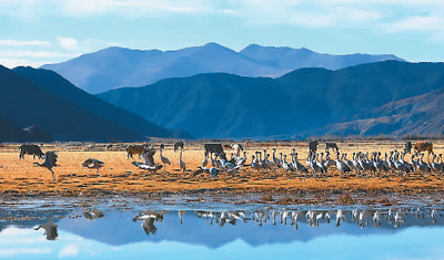 黑頸鶴和其他動物正在西藏日喀則市拉孜縣曲瑪鄉(xiāng)的草地里覓食。瓊達卓嘎、益西旦增攝