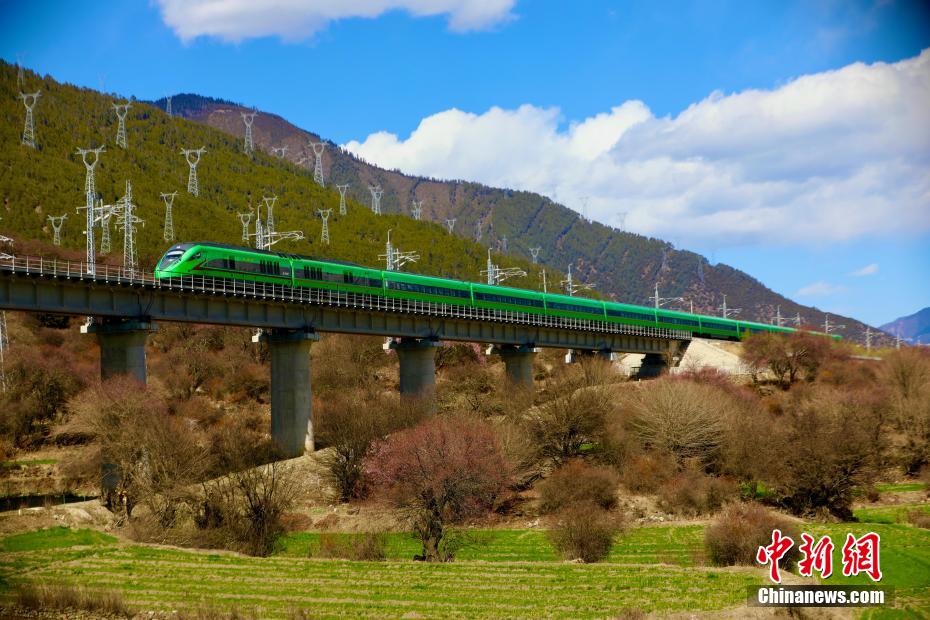 四月伊始,拉林鐵路沿線的桃花迎來了盛開時節(jié),藍天白云下,一朵朵桃花漲紅了臉頰,與遠處的雪山交相輝映,吸引了不少游客來感受高原春天的獨特魅力。當一列列火車穿過花海,映入眼簾的皆是滿山遍野的桃花,讓人仿佛置身于秀美的江南之中。圖為拉林鐵路沿線桃花盛開。馬生明 攝