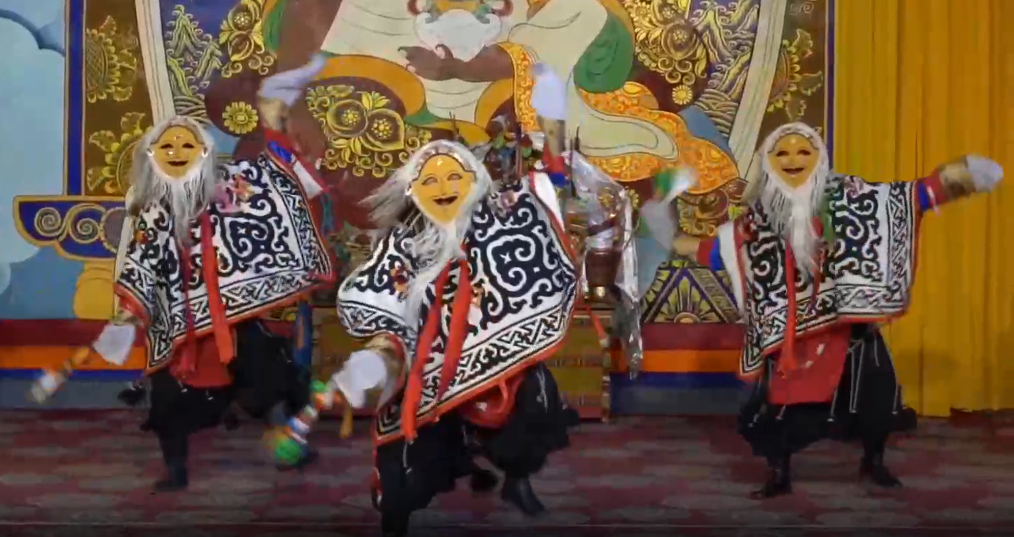 傳統(tǒng)藏戲的服裝從頭到尾只有一套,演員無(wú)需化妝,主要是戴面具表演。整體上看,藏戲分為白面具戲和藍(lán)面具戲。在同一臺(tái)藏戲中,又會(huì)出現(xiàn)紅、白、藍(lán)、黑、黃等不同顏色面具,代表不同身份?!氨热缢{(lán)色面具代表獵人,黃色面具代表高僧、官員等?!蹦岈敶稳收f(shuō)。以戴黃色面具為主的扎西雪巴是白面具藏戲的杰出代表。