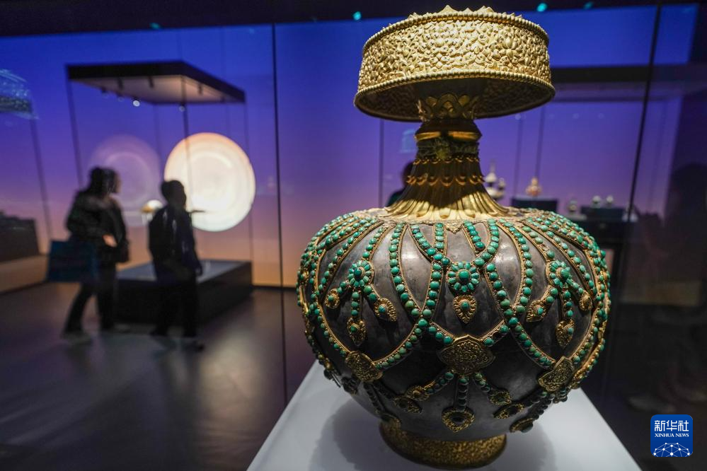 5月11日,“布達(dá)拉宮——來自雪域的世界文化遺產(chǎn)”展覽現(xiàn)場展出的“銀質(zhì)嵌松石瓔珞尊勝瓶”。新華社記者 李博 攝