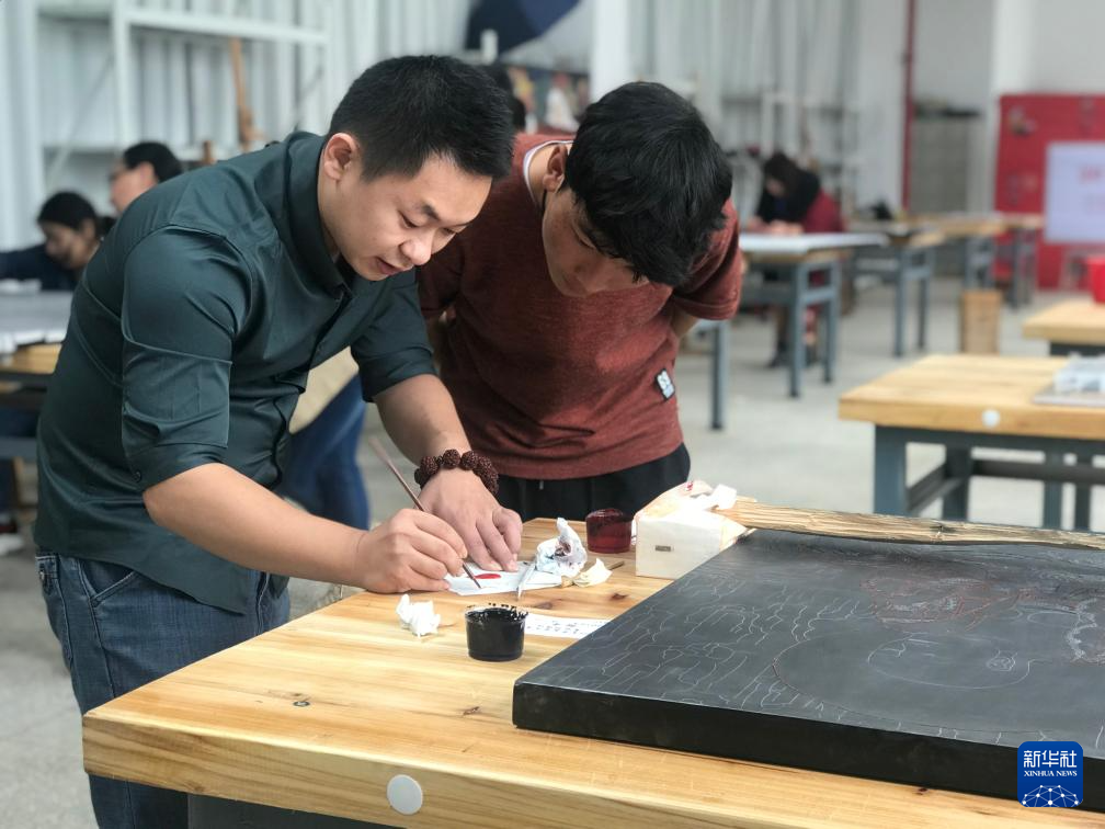 2018年,仁青郎加(右)正跟老師學(xué)習(xí)漆畫技法。新華社發(fā)