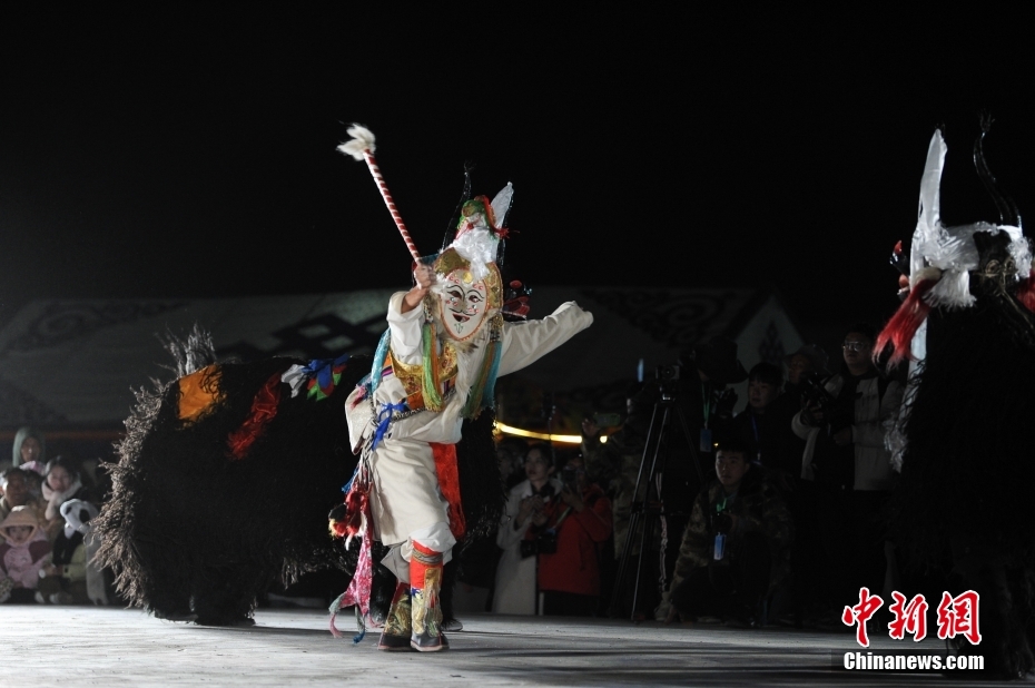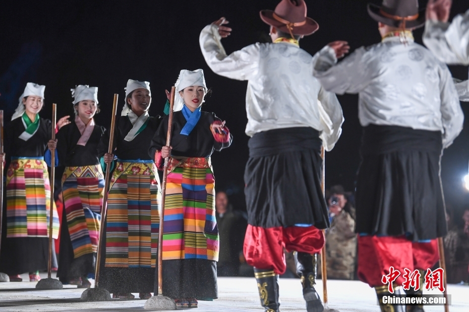 5月18日晚,西藏拉薩市當(dāng)雄縣納木錯湖畔,當(dāng)?shù)啬撩駧в慰腕w驗篝火鍋莊舞。納木錯,被譽為“天湖”,吸引著大量游客前來觀光。圖為篝火鍋莊舞晚會上的文藝演出。