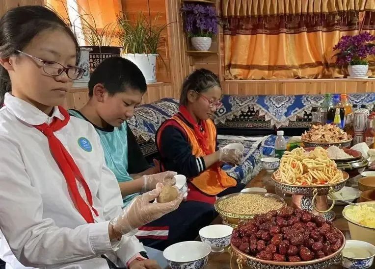 在“藏家”融情交流中,各地少先隊員在農(nóng)家一起學習制作西藏傳統(tǒng)美食糌粑、卡塞等,一個個極具創(chuàng)意造型的“小卡塞”,精致巧妙,隊員們共學、共樂、共享,體悟藏家民族風俗,沉浸在歡樂的氛圍中?!皡⒓哟舜沃黝}隊會交流活動我非常開心,深度體驗了‘藏家’民俗,看到祖國邊疆鄉(xiāng)村的小康生活,豐富的活動讓我增強了對中華民族優(yōu)秀文化的認同感和自豪感,我要繼續(xù)爭做小石榴籽,切實鑄牢中華民族共同體意識”來自重慶市璧山區(qū)劍山實驗小學五(3)中隊隊員李思穎表示。