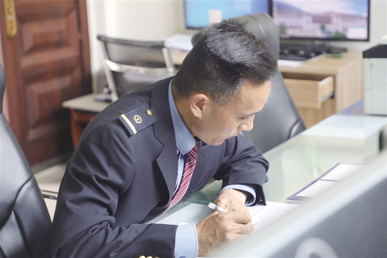 “這里的工作雖然看似單調(diào),實則責(zé)任很大?!辟R文貴身穿深藍色的鐵路制服,胸前佩戴著亮閃閃的工牌,顯得精神抖擻。他像一名嚴謹?shù)膽?zhàn)士,緊盯著操作臺,確認信號,口呼手指?!∽鳛檐囌局蛋鄦T,賀文貴每天的任務(wù)主要是監(jiān)視列車進路和區(qū)間動態(tài),保證行車安全。工作中的他認真負責(zé),嚴格執(zhí)行標(biāo)準化作業(yè),他常說:即使單人值守,該有的程序、作業(yè)步驟一項都不少,作業(yè)標(biāo)準必須嚴格執(zhí)行,保證作業(yè)安全。