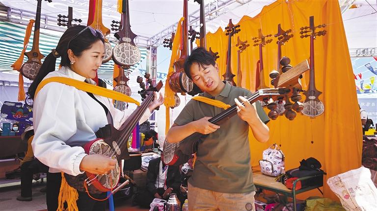 在日喀則高原農(nóng)特產(chǎn)品及尼泊爾特色產(chǎn)品展示展銷活動(dòng)上,商家向顧客介紹扎念琴。記者 扎西頓珠 旦增嘎瓦 攝