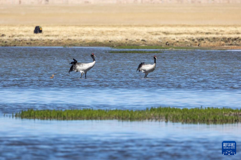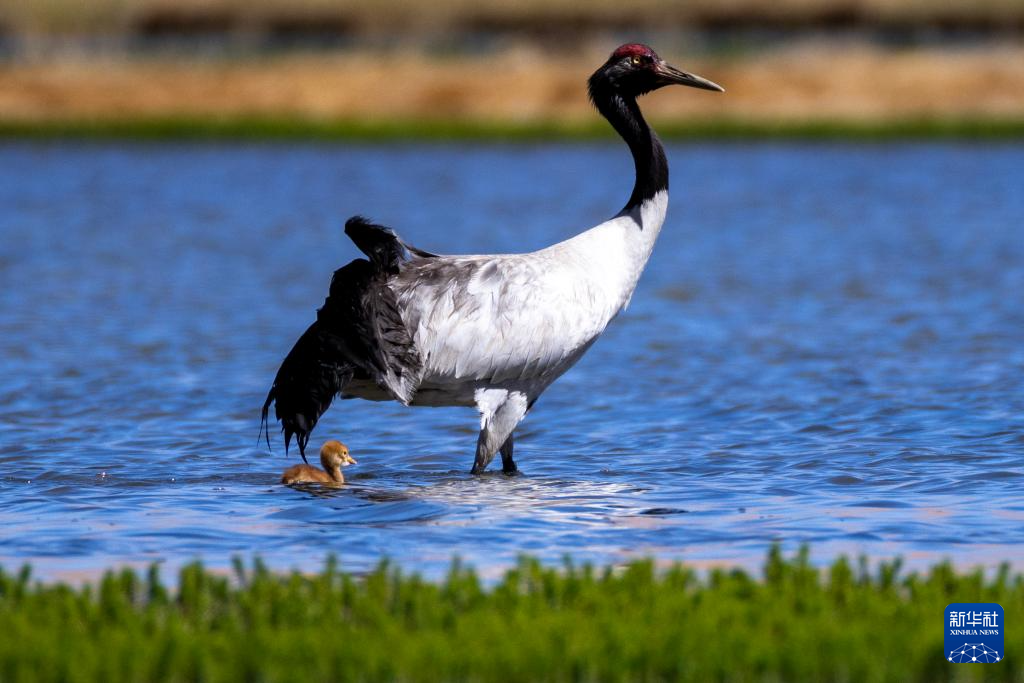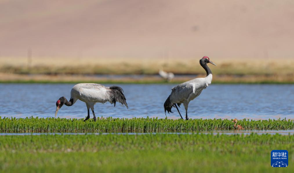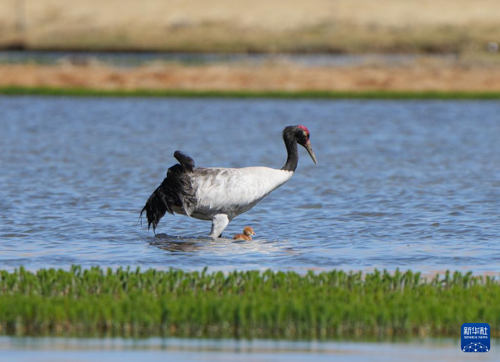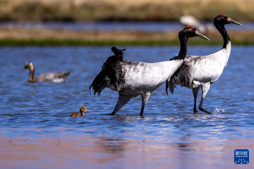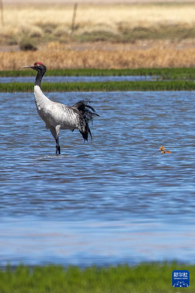 6月9日,黑頸鶴帶著雛鳥(niǎo)在西藏那曲市申扎縣一處濕地棲息、覓食。新華社記者 晉美多吉 攝