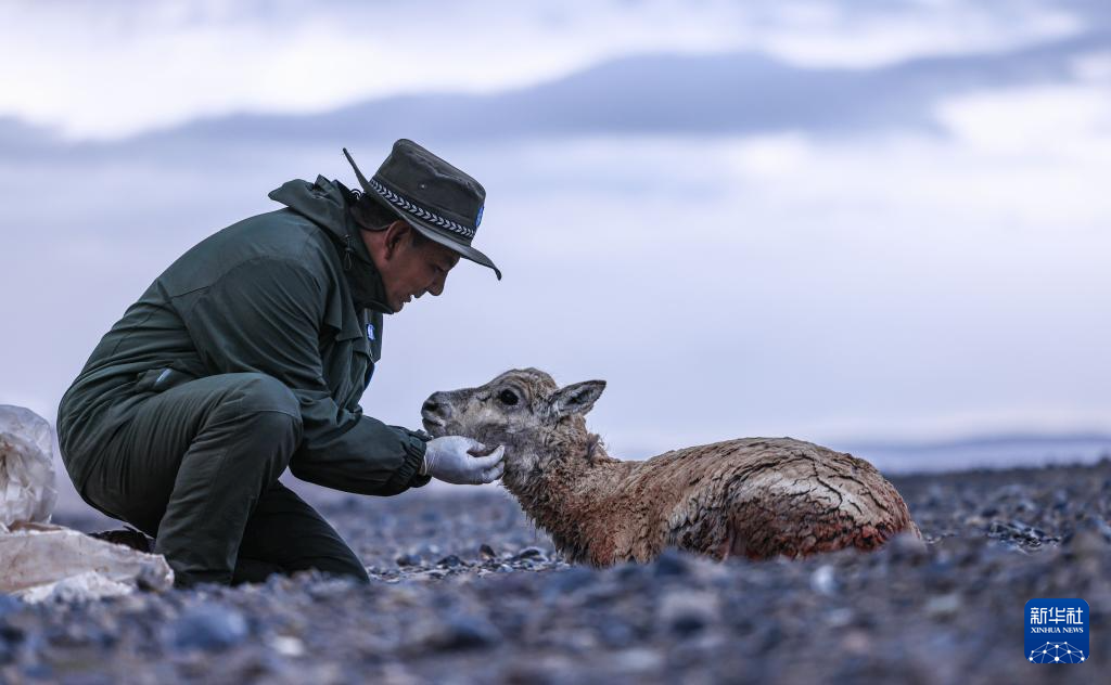 羌塘國家級(jí)自然保護(hù)區(qū)的野保員在安撫受傷的母藏羚羊(6月14日攝)。新華社發(fā)(旦增攝)