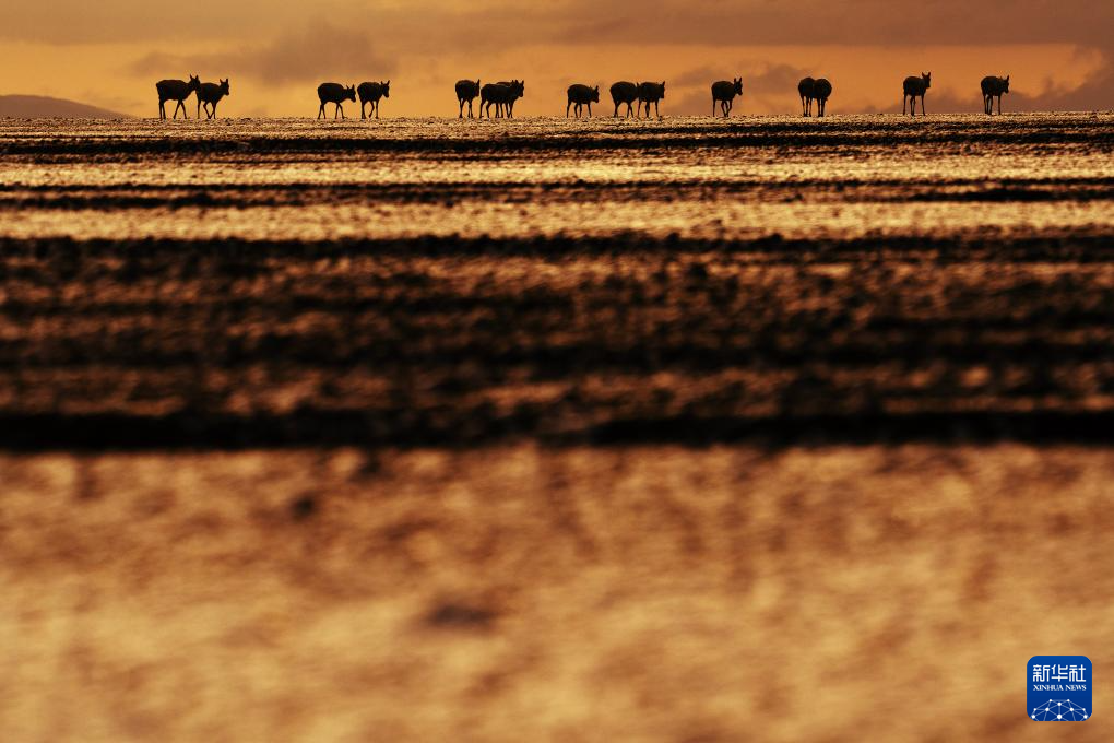 6月14日,在西藏那曲市尼瑪縣境內(nèi)的羌塘國家級(jí)自然保護(hù)區(qū)“無人區(qū)”深處,一群藏羚羊迎著朝陽,行進(jìn)在遷徙路上。新華社記者 費(fèi)茂華 攝