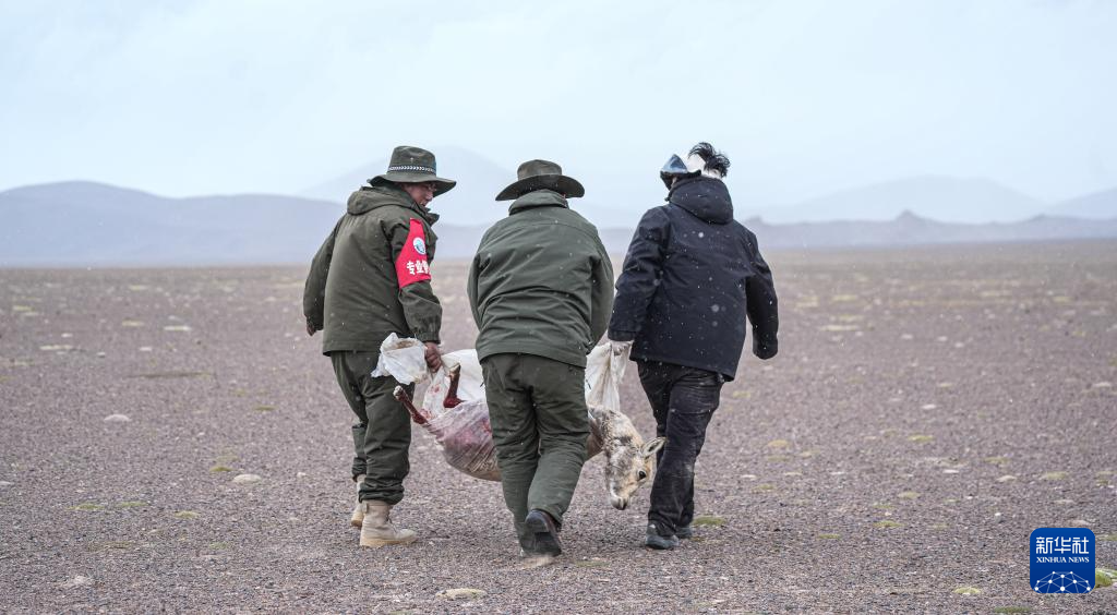 羌塘國家級(jí)自然保護(hù)區(qū)的野保員把受傷的母藏羚羊抬到臨時(shí)營(yíng)地附近(6月14日攝)。新華社發(fā)(旦增攝)