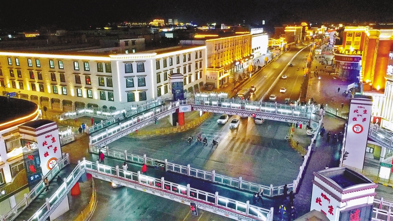 北京市第九批援藏工作隊投入1743.4萬元建設的、拉薩首座配置電梯的城市人行天橋—“連心橋”。