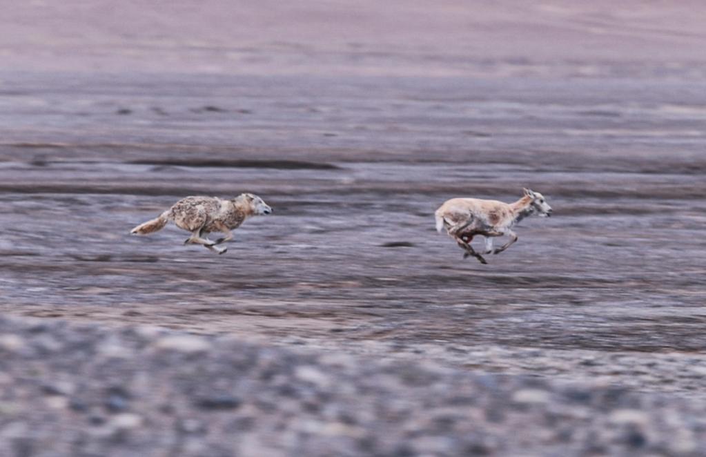 ↑ 在羌塘國家級自然保護區(qū),一只野狼正在捕食遷徙中的母藏羚羊。在藏羚羊的遷徙過程中,野狼、雪豹、藏馬熊和藏野狐等掠食動物守候在遷徙路上,隨時準(zhǔn)備捕食。