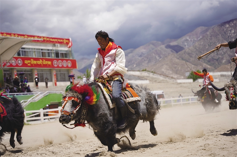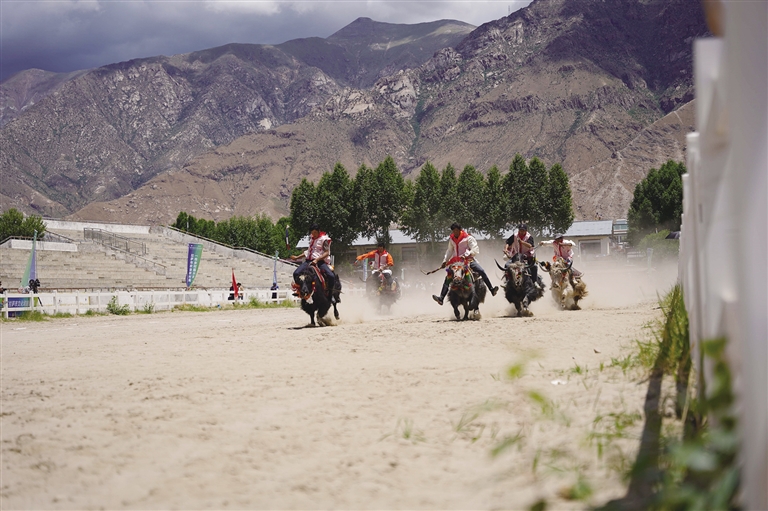 此時(shí),賽場(chǎng)另一邊傳來(lái)歡呼,循聲望去,原來(lái)是本屆運(yùn)動(dòng)會(huì)的賽牦牛正在進(jìn)行。雖然牦牛生性溫和,但讓它們聽(tīng)命令奔跑,也并不容易。記者了解到,參加本屆運(yùn)動(dòng)會(huì)的牦牛均由主人精挑細(xì)選,主人一聲吹哨,輕微地蹬腳,牦牛就會(huì)按指令向前行進(jìn),顯得默契十足。但偶爾也會(huì)發(fā)生小狀況,比如牦牛分不清方向擠成一團(tuán),跑著跑著就停頓休息,或者原路返回等,引得觀眾頻頻發(fā)笑。