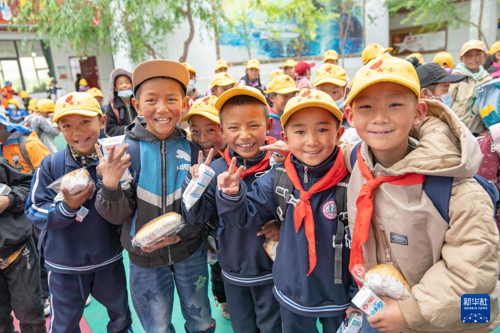 班戈縣中石化小學(xué)學(xué)生手拿營養(yǎng)餐等待放學(xué)(6月22日攝)。新華社記者 丁增尼達 攝