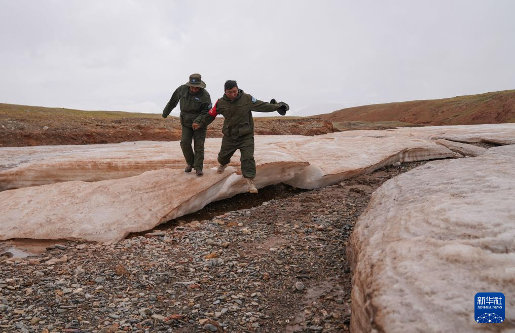 6月15日,羌塘國家級自然保護(hù)區(qū)野生動物專業(yè)管護(hù)隊員索朗(左)和羅布檢查河面冰凍情況。新華社記者 晉美多吉 攝