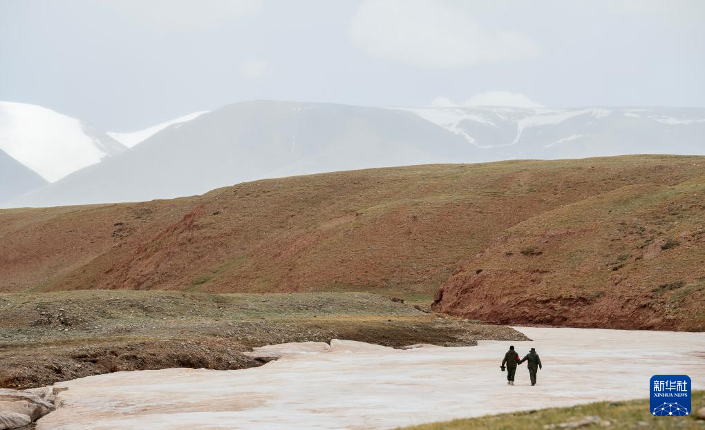 6月15日,羌塘國家級自然保護(hù)區(qū)野生動物專業(yè)管護(hù)隊員索朗(右)和羅布檢查河面冰凍情況。新華社記者 費(fèi)茂華 攝