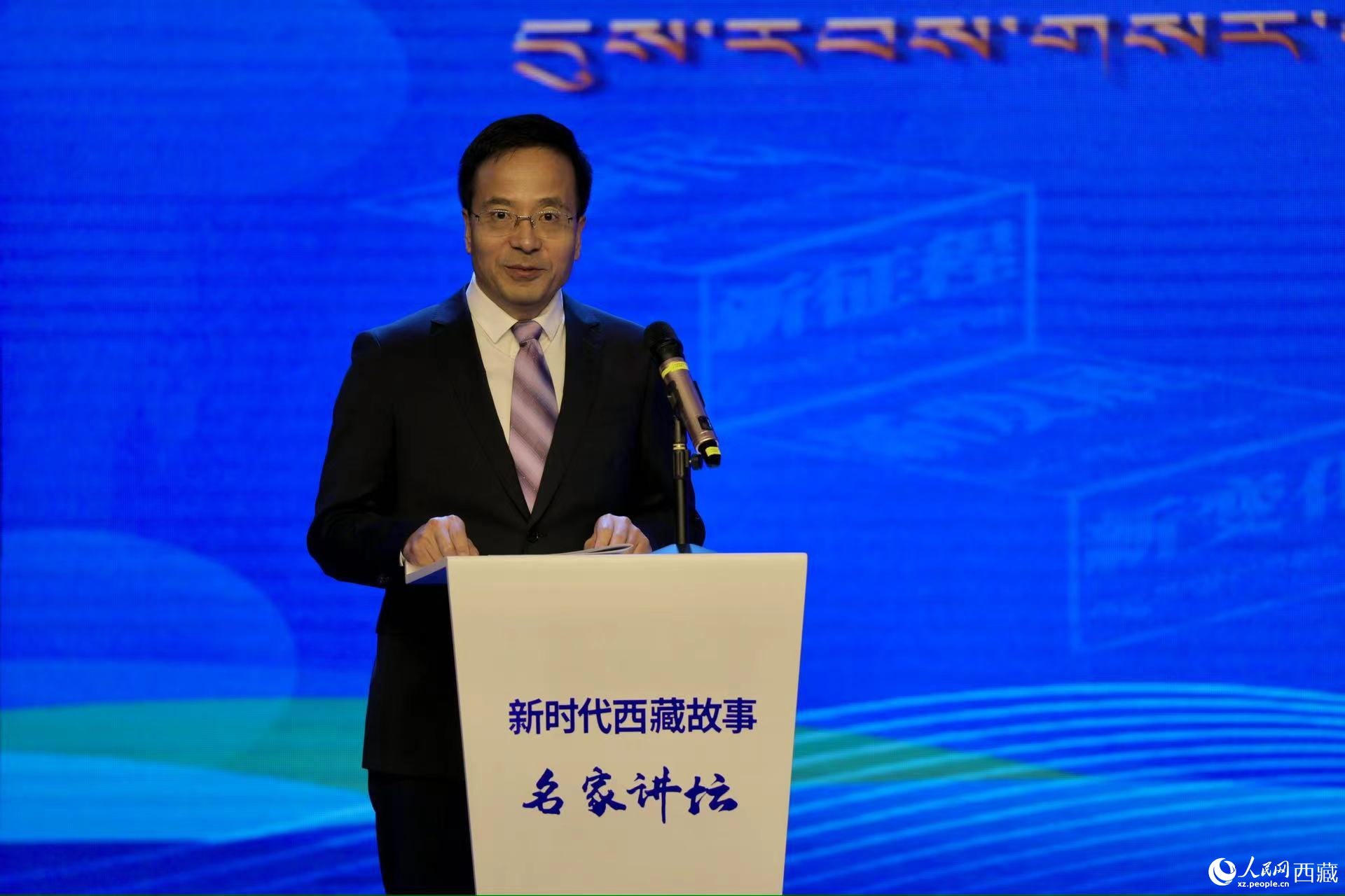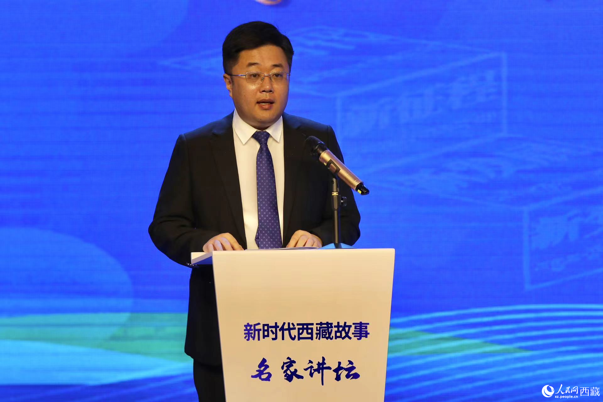 西藏自治區(qū)黨委宣傳部副部長,西藏自治區(qū)社會科學(xué)院黨組書記,中央和國家機關(guān)第七批、第八批援藏干部孫向軍作主題演講。人民網(wǎng)記者 次仁羅布攝