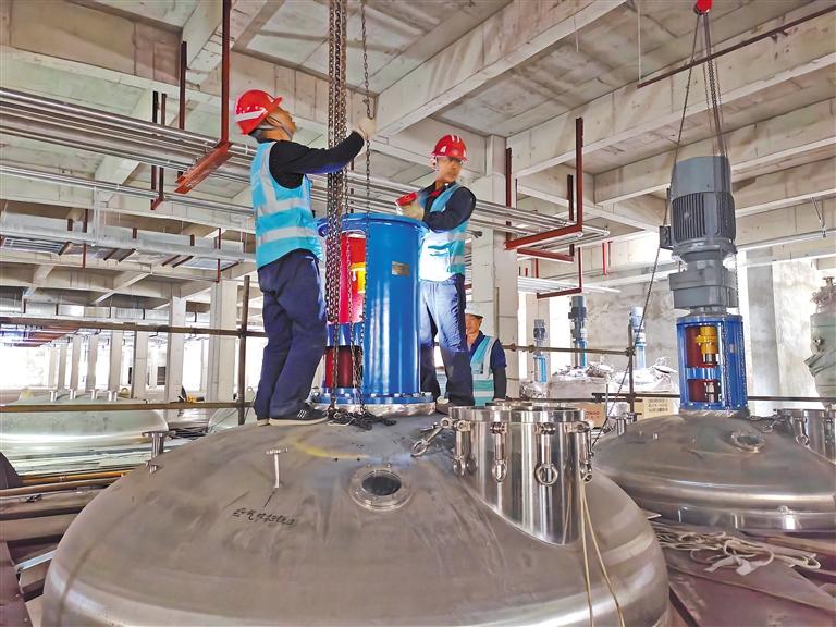 圖為西藏安琪生物科技有限公司工作人員在吊裝生產(chǎn)設(shè)備。
