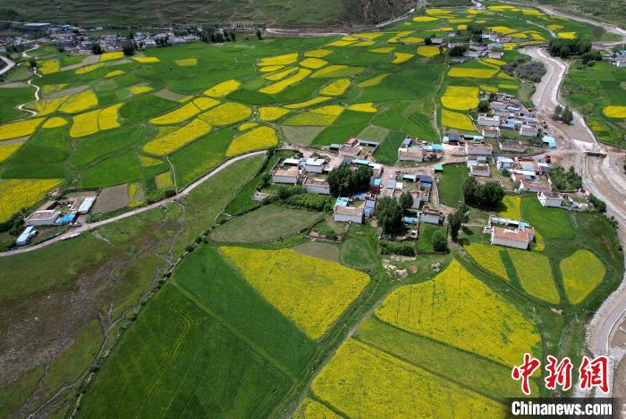 盛夏,西藏墨竹工卡油菜花盛放,一片金黃,風光宜人。油菜花與綠油油的青稞地以及藏式民居,共同繪就鄉(xiāng)村美麗畫卷。圖為7月10日,拉薩市墨竹工卡縣油菜花盛放。(無人機照片)中新社記者 李林 攝