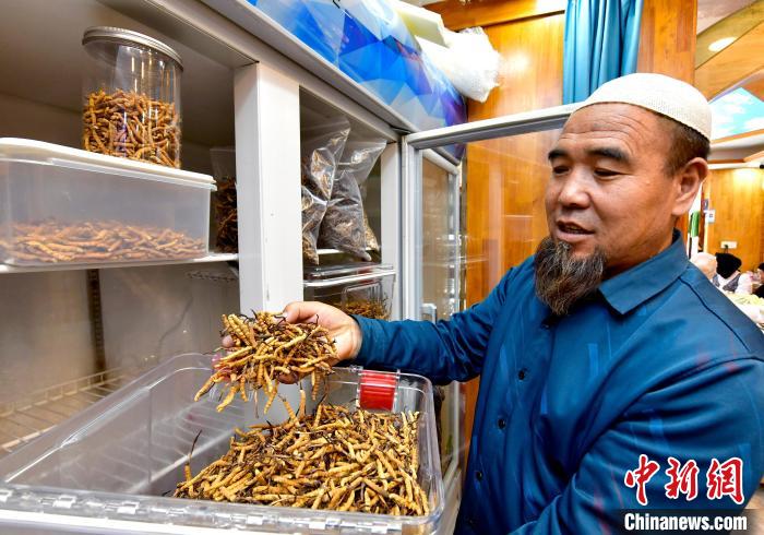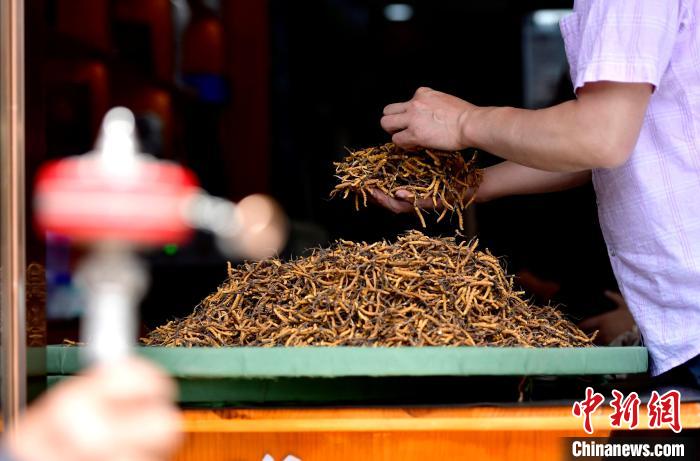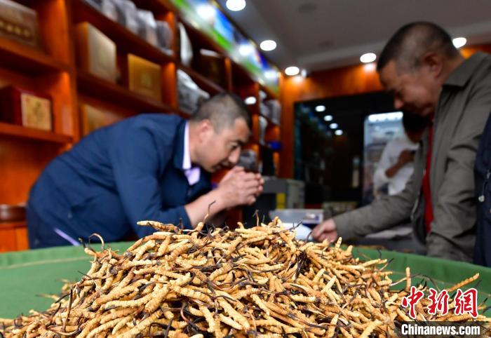 圖為7月16日,蟲草商張華平正在展示店內的蟲草。中新社記者 李林 攝
