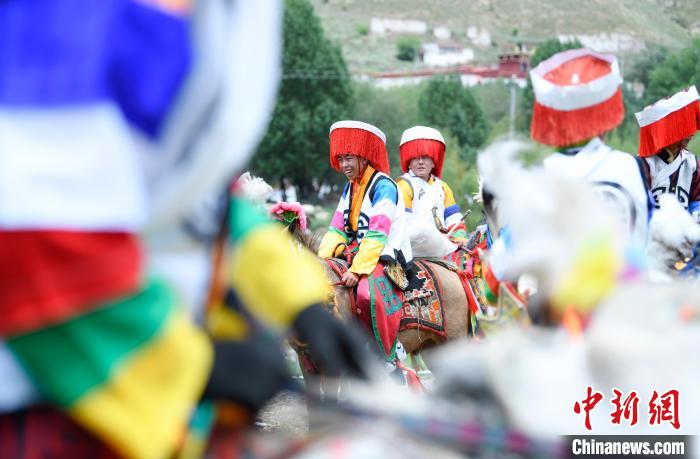 7月21日,西藏自治區(qū)拉薩市堆龍德慶區(qū)馬鎮(zhèn)朗巴村民眾賽馬歡度“望果節(jié)”?!巴?jié)”民俗已有1500多年的歷史,是國家級非物質(zhì)文化遺產(chǎn)。圖為騎手進行馬術(shù)表演。中新社記者 貢嘎來松 攝