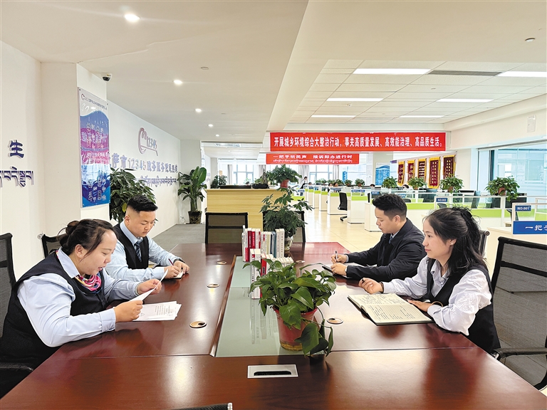 圖為拉薩市行政審批和便民服務(wù)局工作人員對(duì)12345疑難工單進(jìn)行討論。記者 盧文靜 攝