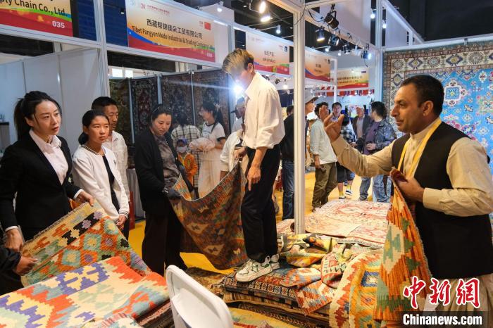 來(lái)自阿富汗喀布爾的商人阿明扎伊·穆罕默德·賈(Aminzai Mohammad Jan)主要銷售阿富汗毛毯等手工藝品,這是他第二次進(jìn)藏展銷。現(xiàn)場(chǎng),阿明扎伊·穆罕默德·賈十分忙碌,不斷為顧客挑選合適的款式和花色,顧客砍價(jià)時(shí),他便掏出手機(jī)播放毛毯的制作過(guò)程。他說(shuō),期待這次銷量更好。