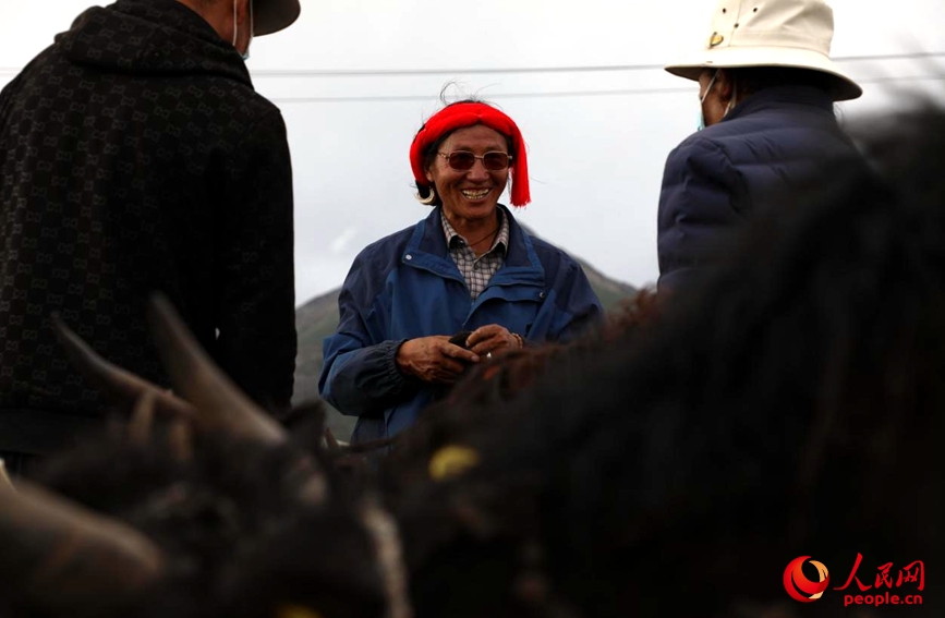 圖為當雄縣郭慶村排隊領取牦牛的村民。人民網記者 次仁羅布攝