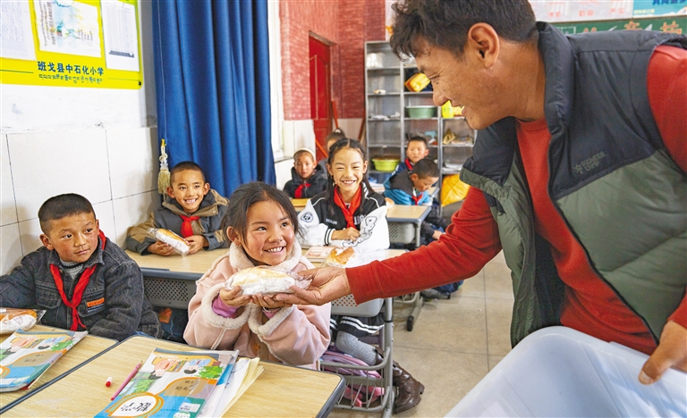 西藏那曲市班戈縣中石化小學(xué)是目前全國海拔最高的援藏小學(xué),由中石化集團(tuán)結(jié)對(duì)幫扶建立,2012年投入使用。圖為班戈縣中石化小學(xué)后勤副校長尼旦為學(xué)生們分發(fā)營養(yǎng)餐(資料圖片)。新華社記者 丁增尼達(dá) 攝