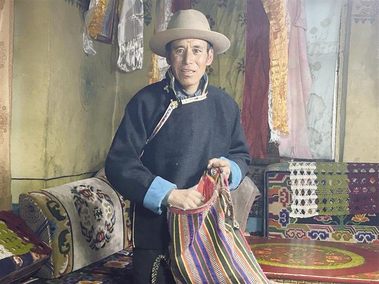 放牧巡邊途中的經(jīng)歷,格桑覺得只是日常的事情,并沒有什么值得講述的。不過,他也有特別珍視的東西。格桑特意走進另一間屋子,捧出一個略顯舊色的布袋。他小心打開袋子,里面是他珍藏的一面面國旗。