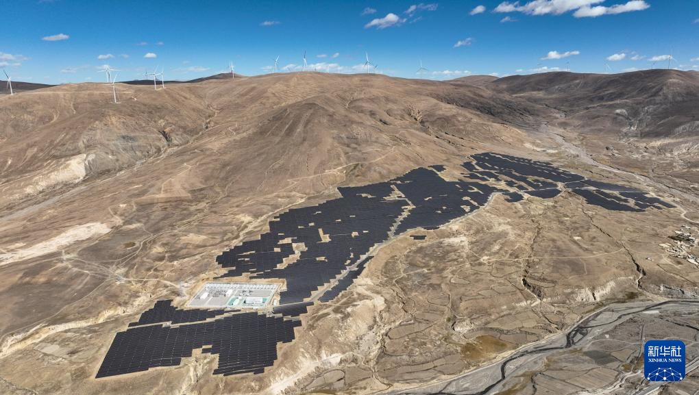 10月17日拍攝的位于西藏日喀則市薩迦縣的中核薩迦300兆瓦風(fēng)光儲(chǔ)一體化電站(無(wú)人機(jī)照片)。新華社記者 晉美多吉 攝