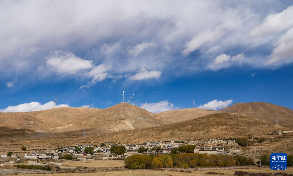 10月17日拍攝的位于西藏日喀則市薩迦縣的風(fēng)力發(fā)電機(jī)組及山腳下的村莊。新華社記者 晉美多吉 攝?