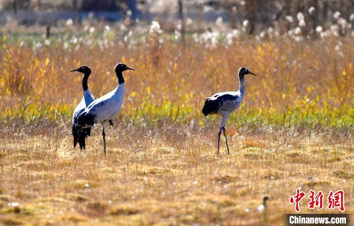 圖為11月3日,黑頸鶴在西藏拉薩達孜區(qū)棲息。中新社記者 李林 攝