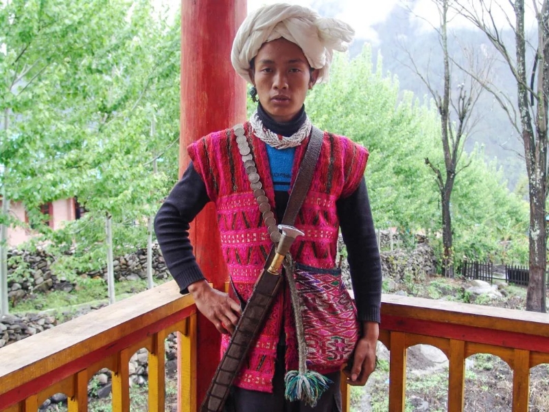 僜人服飾分男裝和女裝。男子上身一般穿無領(lǐng)無袖長衫,多為白色和黑色,他們一般用布條纏繞頭部;僜家女性上衣一般織有彩紋,短及胸部,腰部袒露,下著筒裙,筒裙多用彩格布制作。男女均習(xí)慣用大披肩和挎包。