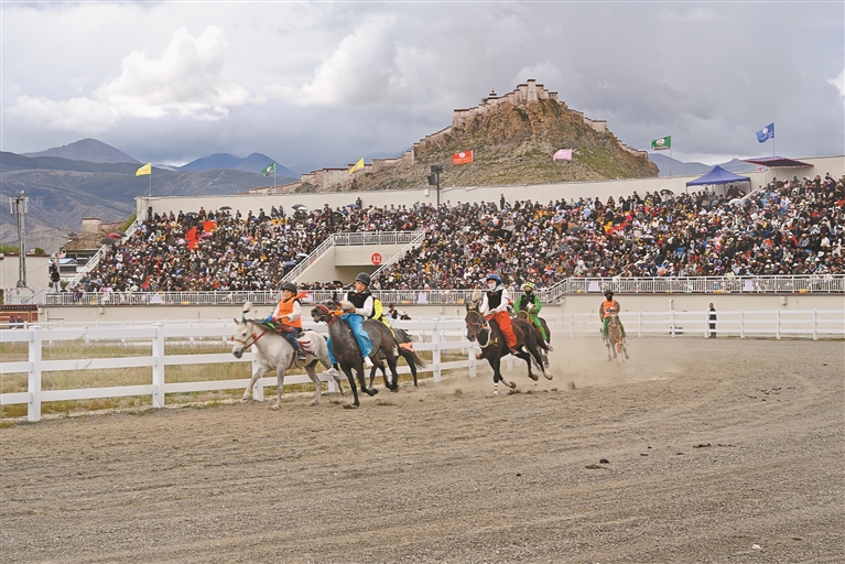 開幕式上,100位騎手策馬奔騰,繞場致意。隨后,擊鼓迎賓、紅色鼓陣、車仁望果、千年名城、英雄江孜、青稞之鄉(xiāng)等10個方隊和來自各鄉(xiāng)鎮(zhèn)的賽馬隊依次入場,全方位、多角度展示了江孜縣特色產(chǎn)業(yè)興旺、基礎(chǔ)設(shè)施提升、民生持續(xù)改善的美好圖景,展現(xiàn)了新時代英雄城兒女堅韌不拔、昂揚(yáng)向上的精神風(fēng)貌,深情表達(dá)了江孜人民對黨的無限感恩、對祖國的無限熱愛、對西藏繁榮發(fā)展的美好祝愿。