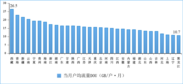 中部地區(qū)移動互聯(lián)網(wǎng)接入流量增速領(lǐng)先,西部部分省份DOU值居全國前列。1—7月份,東、中、西部和東北地區(qū)移動互聯(lián)網(wǎng)接入流量分別達到622.1億GB、330.6億GB、434.6億GB和75.5億GB,同比增長19.1%、20.5%、19.4%和12.5%。西藏、青海、新疆和云南4省7月當月戶均移動互聯(lián)網(wǎng)接入流量(DOU)超過20GB/戶·月;各省DOU值最高值與最低值之差為15.8GB/戶·月,差值較去年同期擴大2.4GB/戶·月。