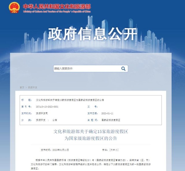 央視網(wǎng)消息:1月11日,文化和旅游部發(fā)布《關(guān)于確定15家旅游度假區(qū)為國(guó)家級(jí)旅游度假區(qū)的公告》。具體內(nèi)容如下: