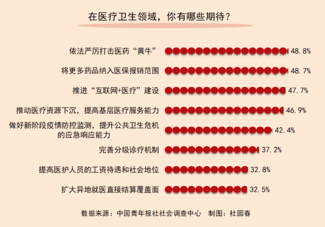 在醫(yī)療衛(wèi)生領(lǐng)域,受訪者的期待還有:做好新階段疫情防控監(jiān)測,提升公共衛(wèi)生危機的應(yīng)急響應(yīng)能力(42.4%),完善分級診療機制(37.2%),提高醫(yī)護人員的工資待遇和社會地位(32.8%),擴大異地就醫(yī)直接結(jié)算覆蓋面(32.5%),加大中醫(yī)藥產(chǎn)品的開發(fā)和運用(24.4%),加強中醫(yī)人才隊伍培養(yǎng),推進中醫(yī)藥傳承創(chuàng)新(20.0%)等。