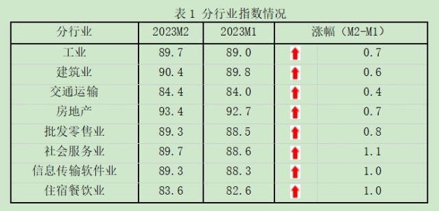 2月份,隨著經(jīng)濟逐步恢復,8個行業(yè)指數(shù)均連續(xù)兩個月上升。服務業(yè)指數(shù)恢復速度領先,其中,社會服務業(yè)、信息傳輸計算機服務軟件業(yè)、住宿餐飲業(yè)和批發(fā)零售業(yè)指數(shù)分別上升1.1、1.0、1.0和0.8點。