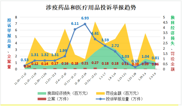 “二十條”和“新十條”出臺后,疫情防控重心從防控感染轉(zhuǎn)到醫(yī)療救治,2022年11月10日至2022年底,全國12315平臺接收相關(guān)投訴舉報24.11萬件,同比增長3.88倍,環(huán)比增長2.95倍,最高峰值達(dá)到19.5倍。其中,投訴14.18萬件,舉報9.93萬件,挽回經(jīng)濟(jì)損失498.17萬元。