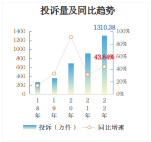 2022年,全國市場監(jiān)管部門受理消費(fèi)者投訴1310.38萬件,同比增長43.84%,增速較2021年有所放大。其中,售后服務(wù)問題增長最快,群眾反映最強(qiáng)烈,同比增長57.67%。消費(fèi)者訴求主要集中在不退款、不發(fā)貨、不履行“三包”承諾、不落實七天無理由退貨義務(wù)、送貨不及時等方面。