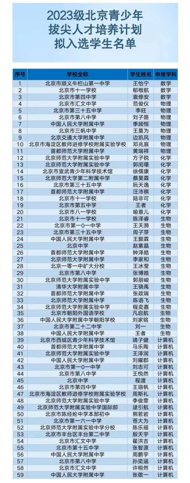 59名中學生擬入選“北京青少年拔尖人才培養(yǎng)計劃”