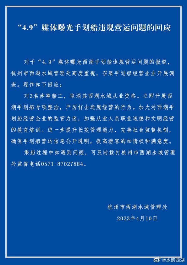 央視網(wǎng)消息:據(jù)@水韻西湖微博消息,對于“4·9”媒體曝光西湖手劃船違規(guī)營運問題的報道,杭州西湖水域管理處高度重視,召集手劃船經(jīng)營企業(yè)開展調查。現(xiàn)作如下回應:
